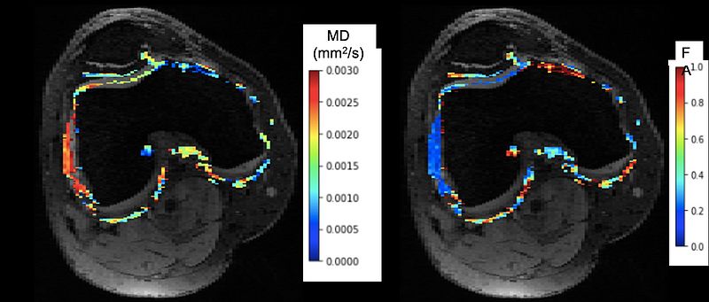 Osteoarthritis is a leading cause of disability in developed countries. While knee MRI is commonly performed to evaluate structural cartilage and synovium modifications, there is a strong need for imaging markers that are sensitive to early changes induced by the disease, before structural modifications will occur. In early stages, OA is characterized by alterations in collagen and glycosaminoglycan content, which can be measure with quantitative MR. Together with an highly multidisciplinary team, I am investigating the potential of T2 and T1rho quantitative MRI as possible outcome measures in a clinical trial where a personalized modified gait training is tested in painful knee OA. I have also led the development of a distortion-free diffusion MRI method to assess cartilage involvement in children with juvenile idiopathic arthritis. We are also investigating the potential of diffusion MRI to characterize cartilage and synovium biochemistry in knee OA.
